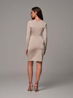 - Design Features: Plunging V neckline, full-length sleeves, ruched front detailing, mini length