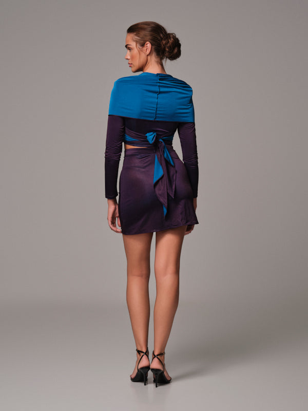 Featuring a bold twist-front cropped top with a high collar and long sleeves, paired with a fitted mini skirt, this set is designed to turn heads and hug your figure in all the right places.